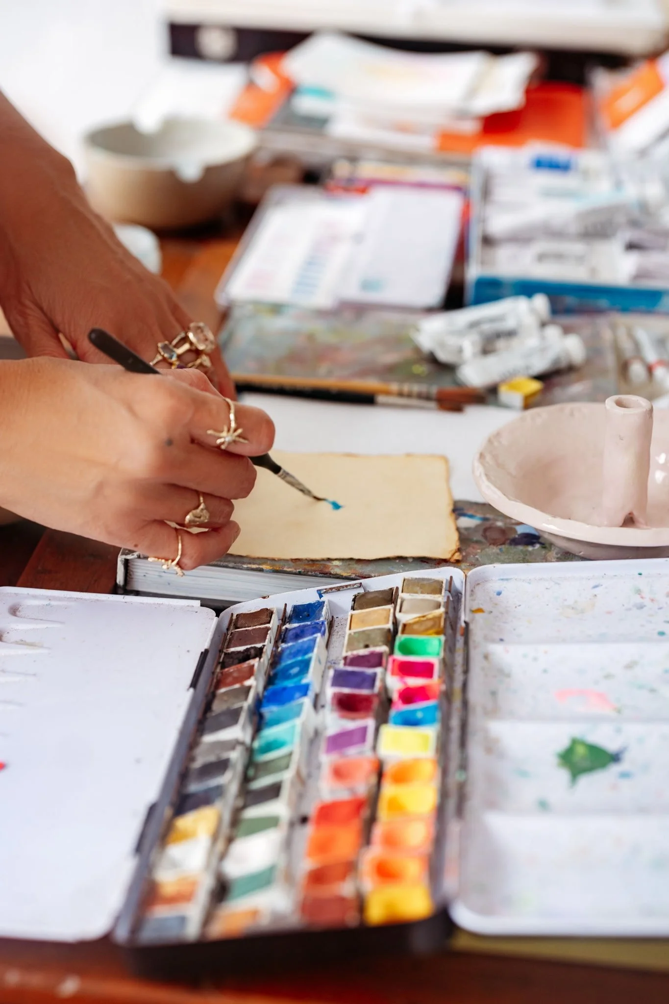 In addition to her jewelry practice, Smith creates channeled spirit paintings and commissioned artworks for private collectors, intuitive works created in meditation that reflect the energetic essence and guidance surrounding the individual they are made for.